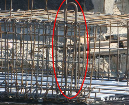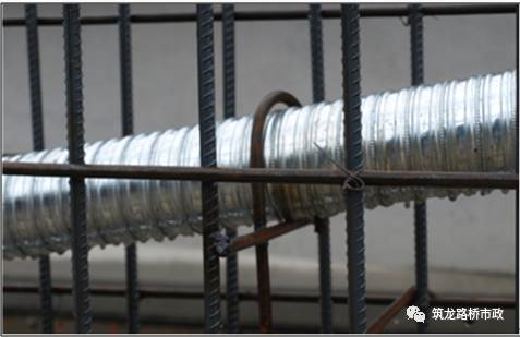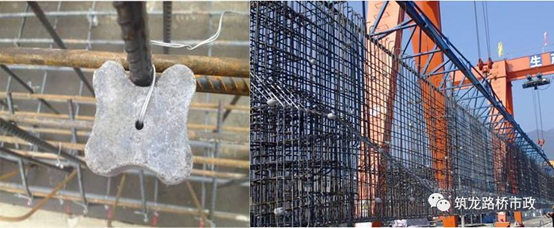 钢筋保护层厚度采用梅花形高强度砂浆垫块,确保垫块能承受足够压力而不破碎,同时采用双扎丝绑扎法。