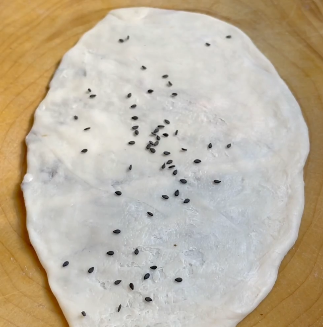 折叠捏紧,按扁,撒黑芝麻
