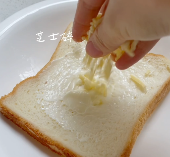 面包片涂沙拉酱抹匀->撒芝士碎