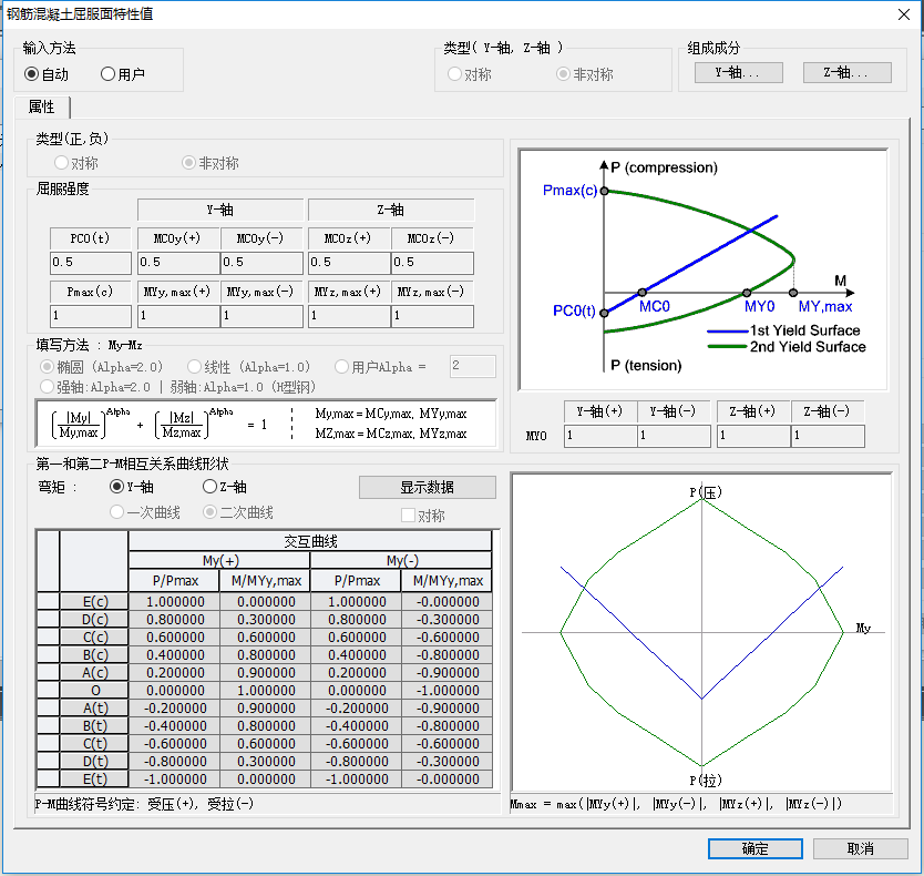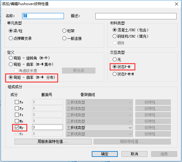 PS. Pushover的铰特性中,集中铰输出转角结果,分布铰输出曲率结果。交互类型中“无”需要用户自己定义弯矩和曲率的非线性关系,“P-M”是通过屈服面确定弯矩曲率的非线性关系,“P-M-M”是通过三轴屈服球确定非线性关系。对于混凝土结构“P-M-M”不适用。此处选择“P-M”,程序这里仅定义屈服面的定义规则,分配特性铰后,程序会根据这里的规则和程序的配筋情况计算最终的铰特性值。