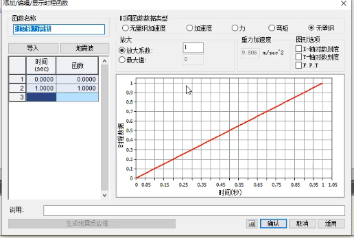 时程函数:地震波时程曲线(时程荷载), 或某种加载路径(时变静力荷载)