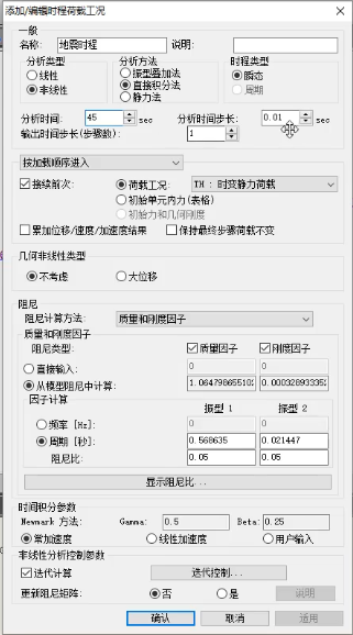 时程荷载工况:确定时程分析的分析方法及阻尼计算方法。